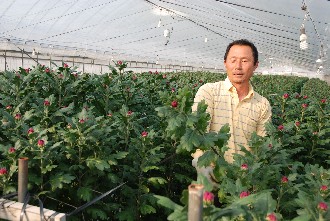 古くから親しまれる大輪の花 気品に溢れる3色の大輪の花が、見る人に和の心をもたらす久留米産「電照菊」。長門石、合川、荒木地区の部会員11人が、秋菊5品種と夏菊3品種を組み合わせ、5.9haで周年栽培しています。 今年産は、年間販売数量220万本、年間販売金額1億5,000万円を目標に、関東、中国、九州地方の4市場に出荷しています。 部会では、月に1回程度のペースで現地互評会を実施し、久留米普及指導センター職員とともに部会員のほ場を巡回。生育状況を確認しています。